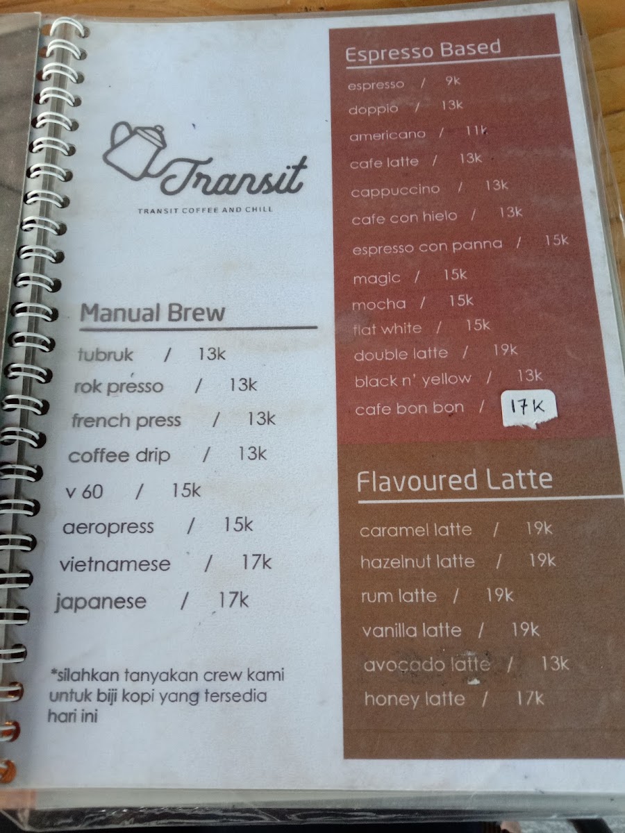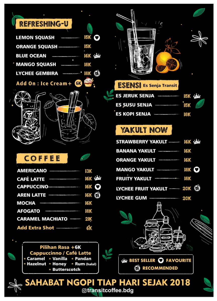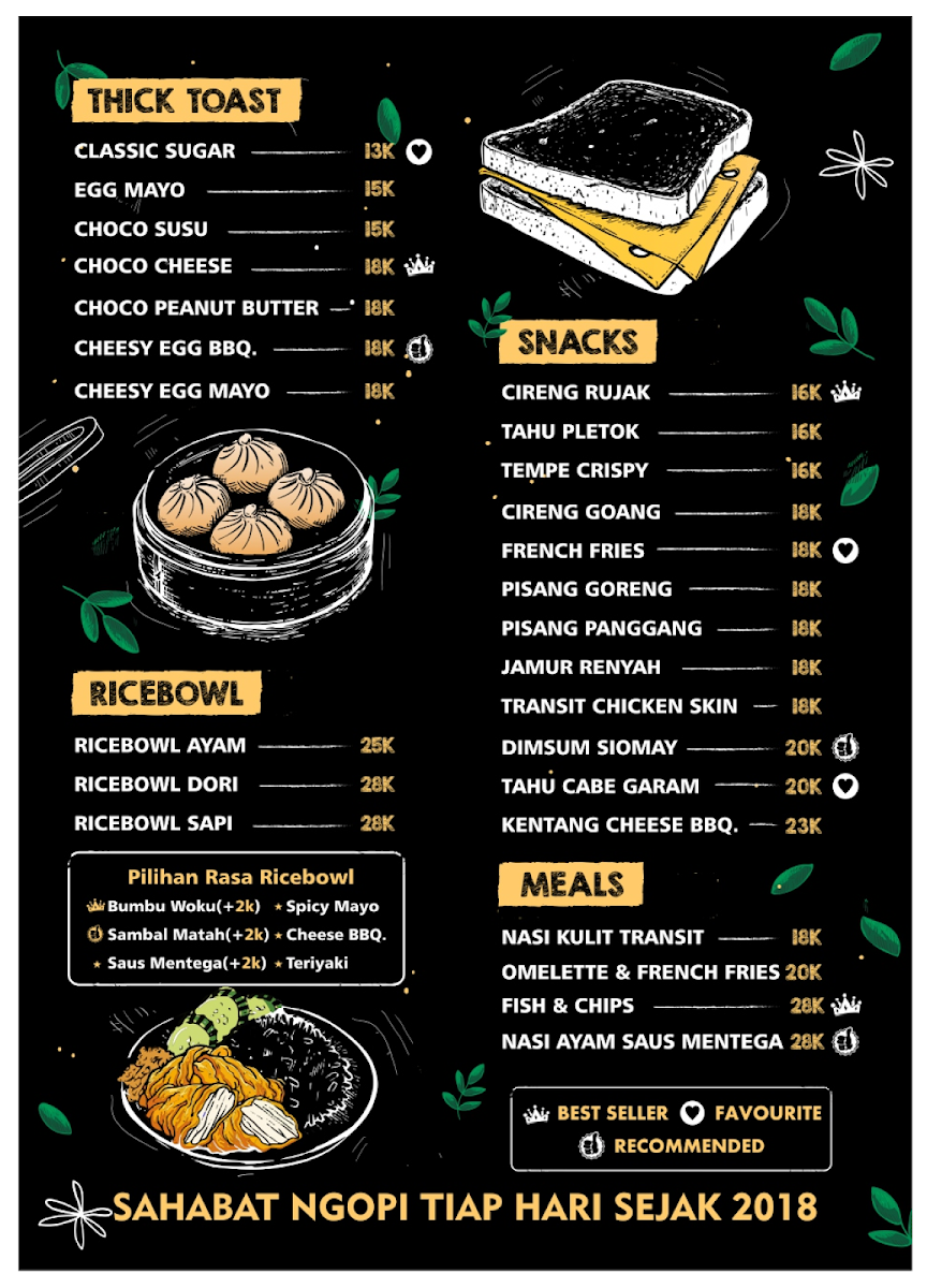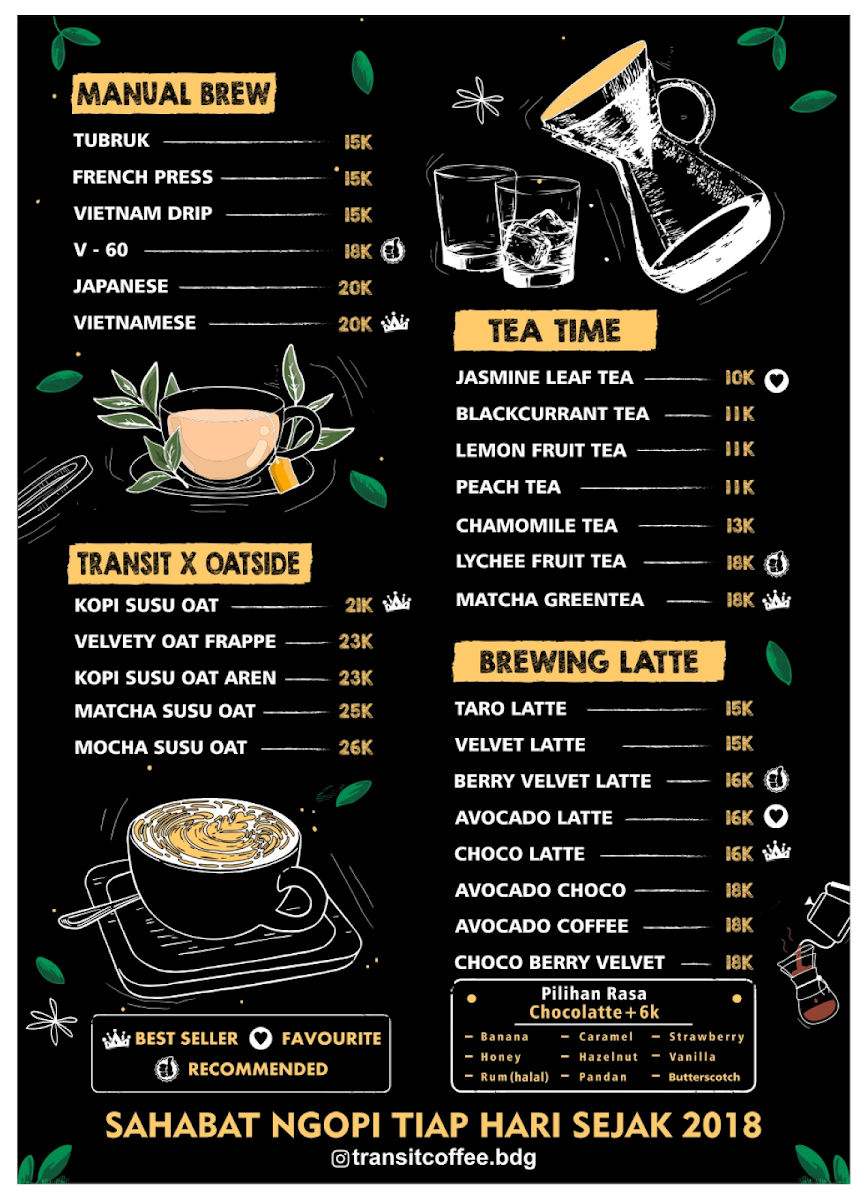 Nestled in the vibrant streets of Bandung, Transit Coffee offers an inviting blend of affordability and flavor. The enticing menu features a variety of options, from rich manual brew coffee to delightful traditional snacks like banana fry and crispy mushroom. Reviews highlight generous portions and a value that outshines nearby competitors, making it a go-to spot for both casual hangouts and quality bites.